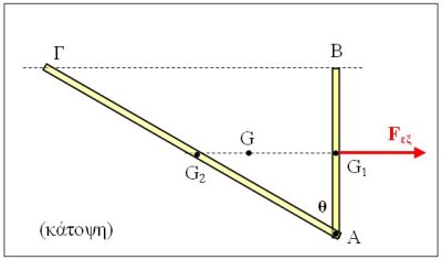 Δύο λεπτές ομογενείς ράβδοι ΑΒ και ΑΓ έχουν μάζες Μ, 2∙Μ και μήκη L, 2∙L αντίστοιχα. Τις συνδέουμε σταθερά στο ένα άκρο Α (π.χ. με συγκόλληση ή με βίδα / παξιμάδι και καλό σφίξιμο) έτσι ώστε να δημιουργηθεί ένα στερεό σχήματος (ανοικτού) ορθογωνίου τριγώνου με γωνία θ=60º μεταξύ των ράβδων. Το στερεό ηρεμεί ακουμπισμένο πάνω σε λείο οριζόντιο δάπεδο και κάποια στιγμή ασκούμε σταθερή οριζόντια δύναμη μέτρου Fεξστο μέσο της μικρής ράβδου και κάθετα προς αυτή, όπως στο σχήμα.