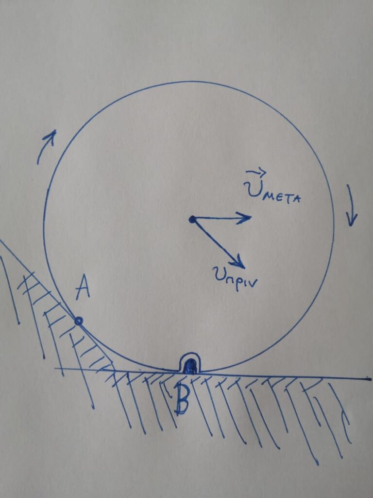 Αρα με αναλυση ταχυτητας οπως ειπες προκυπτει ευκολα οτι η ταχυτητα του κεντρου μαζας θα μειωθει. Αν στην συνεχεια το οριζοντιο επιπεδο λιγο πιο δεξια παψει να ειναι λειο,.η εχει ενα μηχανισμο οπως αυτο του σχηματος μου,θα αποκατασταθει κανονικη κυλιση αφου θα προσαρμοστει και η γωνιακη ταχυτητα.Αρα για να δικαιολογησουμε απλως την μειωμενη ταχυτητα κυλισης μετα την μεταβαση στο οριζοντιο επιπεδο δεν ειναι απαραιτητο να επικαλεστουμε διατηρηση στροφορμης, γινεται και με πιο στοιχειωδεις μεθοδους.