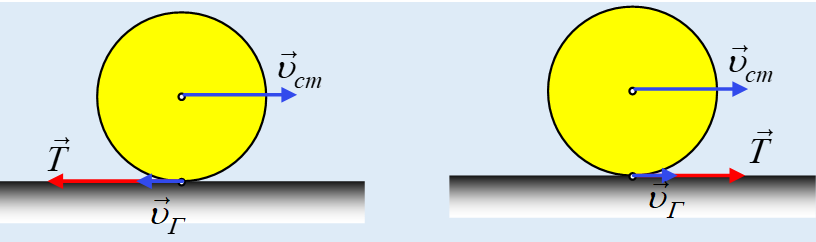 Έστω τώρα ότι εμφανίζεται μια τριβή προς τα αριστερά (πρώτο σχήμα). Τότε ο κύλινδρος θα αποκτούσε μια αρνητική επιτάχυνση κέντρου μάζας, με αποτέλεσμα να μειώνεται η ταχύτητα υcm, ενώ η ροπή της τριβής θα επιτάχυνε την στροφική κίνηση με αποτέλεσμα να αυξάνεται η γωνιακή ταχύτητα. Έτσι η σχέση (1) θα έπαυε να ισχύει, αλλά κυρίως (μας ενδιαφέρει…) το σημείο επαφής με το έδαφος θα αποκτούσε ταχύτητα προς τα αριστερά, άρα αυτομάτως η τριβή θα έπρεπε να αλλάξει κατεύθυνση και να είναι προς τα δεξιά.