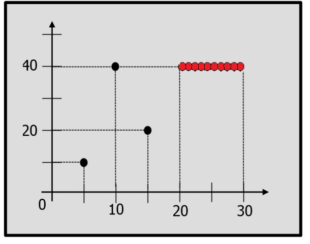 Σχετικά με το διάγραμμα (που είναι μισό σημειοσύνολο και μισό συνεχής γραμμή) οι εφαρμογές μου δέιχνουν ότι είναι πετυχημένη επιλογή: Ένα 80-90% των παιδιών, όταν τους ζητείται να περιγράψουν τι "τους λέει" η συνεχής γραμμή στο διάγραμμα περιγράφουν ή το σημείο (20s, 40m/s) ή το σημείο (30s, 40m/s) ή και τα δύο. Όμως ελάχιστοι αναφέρονται στο ενδιάμεσο διάστημα (20<t<30). Η λύση που έχω βρει σε αυτό είναι να αναφέρομαι στην ευθεία σαν ένα σύνολο από πάμπολλες μεμονωμένες μετρήσεις (που αυτό είναι), ερωτήσεις όπως "στο t=23s μέτρησε κανείς;" και να κάνω σχήματα όπως το παρακατω: