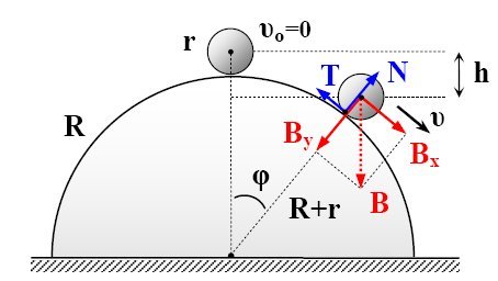 Το κυρτό ημισφαίριο του σχήματος έχει ακτίνα R και στην κορυφή του βρίσκεται σφαίρα ακτίνας r. Ο συντελεστής οριακής στατικής τριβής μεταξύ ημισφαιρίου και σφαίρας είναι μ. Αν αφήσουμε τη σφαίρα ελεύθερη, θα αρχίσει να κινείται πάνω στο ημισφαίριο και σε κάποια θέση (κάποια γωνία φ ως προς την κατακόρυφη) θα χάσει την επαφή της μ’ αυτό.