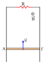Ένας αγωγός ΑΓ μήκους ℓ=1m μάζας 0,2kg και αντίστασης r=0,5Ω, εκτοξεύεται κατακόρυφα με φορά προς τα πάνω, σε επαφή με δύο κατακόρυφους στύλους, χωρίς αντίσταση, τα πάνω άκρα των οποίων συνδέονται μέσω αντιστάτη με αντίσταση R=1,5Ω. Ο αγωγός κινείται κάθετα στις δυναμικές γραμμές ενός οριζόντιου ομογενούς μαγνητικού πεδίου έντασης Β=0,5Τ, όπως στο σχήμα και σε μια στιγμή t1 έχει ταχύτητα υ=6m/s.