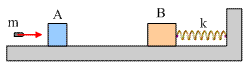 Σε ένα οριζόντιο επίπεδο ηρεμούν δυο σώματα Α και Β με μάζες m1=0,95kg και m2=2kg, όπου το Β είναι δεμένο στο άκρο ελατηρίου σταθεράς k=10Ν/m, το οποίο έχει το φυσικό του μήκος. Τα σώματα παρουσιάζουν με το επίπεδο συντελεστή τριβής μ=0,5 και η απόσταση μεταξύ τους είναι d=2m. Σε μια στιγμή ένα βλήμα μάζας m=50g το οποίο κινείται οριζόντια πάνω στην ευθεία που συμπίπτει με τον άξονα του ελατηρίου, με ταχύτητα υ=120m/s σφηνώνεται στο σώμα Α.