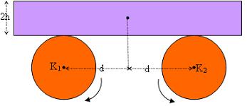 Οι άξονες δύο ομοίων κυλίνδρων Κ1 και Κ2 είναι παράλληλοι, βρίσκονται στο ίδιο οριζόντιο επίπεδο και σε απόσταση 2d. Αφήνουμε μία ισοπαχή ομογενή δοκό Δ μάζας m και ύψους 2h πάνω στους κυλίνδρους έτσι ώστε το μέσον της να βρίσκεται στην ίδια κατακόρυφο με το μέσον της απόστασης Κ1Κ2. Με κατάλληλο μηχανισμό βάζουμε τους κυλίνδρους σε περιστροφή, όπως δείχνει το σχήμα. Ο συντελεστής τριβής ανάμεσα στη δοκό και στους κυλίνδρους είναι μ. Απομακρύνουμε την δοκό από την θέση ισορροπίας της και την αφήνουμε ελεύθερη να κινηθεί