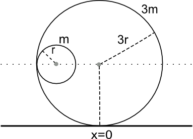 Δύο δακτύλιοι, ένας μικρός μάζας m και ακτίνας r και ένας μεγάλος μάζας 3m και ακτίνας 3r βρίσκονται ο ένας μέσα στον άλλο όπως στο σχήμα. Ο μικρός κυλάει χωρίς ολίσθηση μέσα στον μεγάλο.