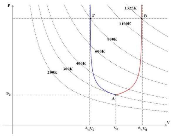 Μια ενδεικτική απεικόνιση των δύο μεταβολών σε P-V (με το graph).Παρατηρείστε ότι το πηλίκο ΤΒ/ΤΓ έχει φτάσει πρακτικά την τιμή 1,66 (δηλ. 5/3).