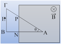 Ένα τριγωνικό ορθογώνιο και ισοσκελές πλαίσιο διαρρέεται από ρεύμα Ι=2Α και βρίσκεται κατά ένα τμήμα του μέσα σε ομογενές μαγνητικό πεδίο έντασης Β=2Τ, όπως στο σχήμα, όπου (ΑΝ)=1m.Να βρείτε την δύναμη που δέχεται το πλαίσιο από το πεδίο.