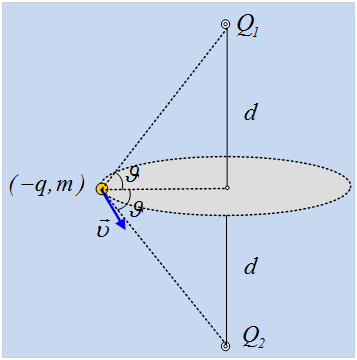 Τρίτο φορτίο –q που είναι αποθηκευμένο σε σφαιρίδιο μάζας m εκτοξεύεται οριζόντια με ταχύτητα u και από απόσταση R από την κατακόρυφο που διέρχεται από τα δύο φορτία και κάθετα στο επίπεδο των τριών φορτίων. Το σημείο εκτόξευσης ισαπέχει από τα φορτία Q1, Q2. Παρατηρούμε ότι η κίνηση του φορτισμένου σφαιριδίου είναι ομαλή κυκλική.