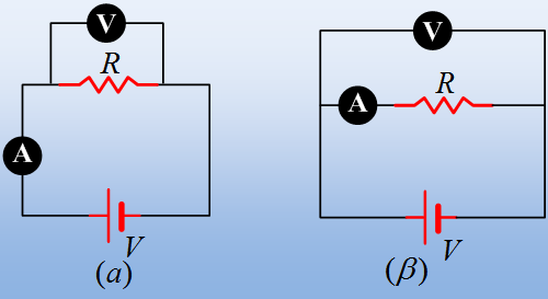 Στο (α) κύκλωμα το σφάλμα μας το δημιουργεί το βολτόμετρο, αφού, αντίθετα με αυτό που θα θέλαμε, διαρρέεται από ρεύμα. Αν λοιπόν η εσωτερική του αντίσταση είναι πολύ μεγαλύτερη από την μετρούμενη αντίσταση, τα πράγματα είναι ικανοποιητικά.
