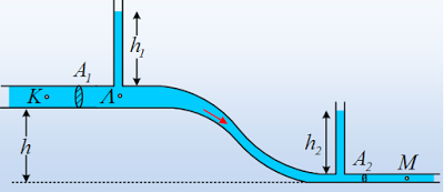 Στο σχήμα φαίνεται ένα τμήμα ενός δικτύου ύδρευσης με μια μόνιμη και στρωτή ροή, σταθερήςπαροχής 3,5L/s. Το νερό πυκνότητας ρ=1.000kg/m3 θεωρείται ιδανικό ρευστό και τα δυο οριζόντια και σταθερής διατομής τμήματα του σωλήνα, απέχουν κατακόρυφη απόσταση h=0,5m. Οι οριζόντιοι σωλήνες έχουν διατομές Α1=70cm2 και Α2=10cm2, ενώ δύο λεπτοί κατακόρυφοι σωλήνες, έχουν συγκολληθεί σε αυτούς, με αποτέλεσμα το νερό να ανέρχεται στο εσωτερικό τους κατά h1=80cm και h2 αντίστοιχα.