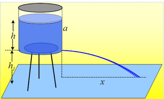 Σε ένα τρίποδο σε ύψος h1=1,2m από το έδαφος, έχουμε στερεώσει ένα δοχείο το οποίο είναι αεροσταγώς κλεισμένο και το οποίο περιέχει νερό μέχρι ύψος h=0,8m. Το δοχείο, κυλινδρικού σχήματος, έχει εμβαδόν βάσεως 0,3m2 και ύψος α=1m. Αν ανοίξουμε μια μικρή τρύπα, κοντάστη βάση του δοχείου, το νερό πετάγεται, φτάνοντας σε οριζόντια απόσταση x=12m, ενώ σιγά- σιγά η φλέβα εξασθενεί και μετά από λίγο, το νερό σταματά να τρέχει.