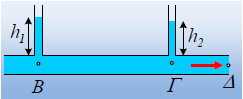 Σε ένα οριζόντιο σωλήνα σταθερής διατομής 100cm2 έχουμε μια στρωτή ροή νερού. Σε δύο σημεία Β και Γ, τα οποία απέχουν οριζόντια απόσταση x=4m, συνδέονται δυο λεπτοί κατακόρυφοι σωλήνες, στους οποίους το νερό ανέρχεται σε ύψη h1=40cm και h2=39,6cm αντίστοιχα, όπως στο διπλανό σχήμα. Κάποια στιγμή, την οποία θεωρούμε t=0, η παροχή του σωλήνα, είναι Π0=0,2L/s.