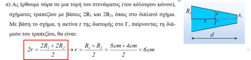 Η Γεωμετρία παιδιά, όπως και να το κάνουμε είναι εδώ, αν και το πρόβλημα εδώ δεν είναι Γεωμετρικό. Μπορεί, αν η άσκηση δοθεί σε παιδιά, να μην ονομαστεί ο κόλουρος κώνος! αλλά να ονομαστεί η τομή ως τραπέζιο ή να μην ειπωθεί τίποτα, απλά να δοθεί η διατομή στο Γ!!! Άλλωστε και το σχόλιο στο τέλος, δεν απευθύνεται σε μαθητές. Αν δείτε τις σχέσεις, προφανώς δεν απευθύνονται σε αυτούς.