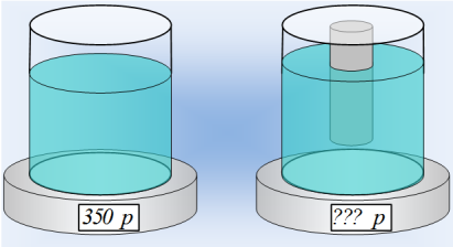 Πάνω σε μια ζυγαριά, τοποθετούμε ένα ποτήρι μισογεμάτο με νερό. Η ένδειξη της ζυγαριάς είναι 350p. Μέσα στο νερό μισοβυθίζουμε έναν μικρό κύλινδρο, συγκρατώντας τον με το χέρι μας (πράγμα που σημαίνει ότι ισορροπεί και με την επίδραση κάποιας δύναμης από εμάς).