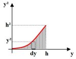Το άθροισμα ∑y²∙dy ισούται με το γραμμοσκιασμένο εμβαδό του διπλανού διαγράμματος. Το εμβαδό αυτό γνωρίζουμε από τη γεωμετρία (θεώρημα του Αρχιμήδη) ότι είναι το ⅓ του ορθογωνίου με πλευρές h και h². Οπότε:∑y²∙dy = ⅓∙h³
