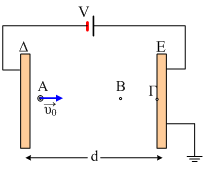 Ένα σωματίδιο με φορτίο q=-1nC και μάζα m=10-10kg, κινείται παράλληλα προς τις δυναμικές γραμμές του ομογενούς ηλεκτρικού πεδίου του σχήματος, παράλληλα προς τις δυναμικές γραμμές και σε μια στιγμή (t0=0) περνάει από το σημείο Α με ταχύτητα υ0=40m/s.