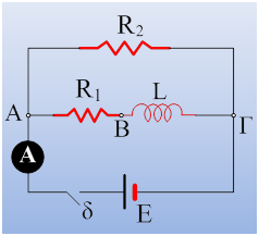 Για το παραπάνω κύκλωμα δίνονται Ε=40V (r=0), R1=4Ω, R2=8Ω, το ιδανικό πηνίο έχει συντελεστή αυτεπαγωγής L=0,4Η, ενώ ο διακόπτης δ είναι ανοικτός.