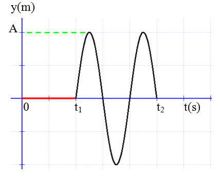 στην επιφάνεια υγρού εγκάρσια αρμονικά κύματα που διαδίδονται με ταχύτητα υ. Μικρό κομμάτι φελλού βρίσκεται σε κάποιο σημείο Σ της επιφάνειας πλησιέστερα στην πηγή Π1. Η ταλάντωση του φελλού ξεκίνησε την t1 ενώ η συμβολή την t2. Στο διπλανό διάγραμμα φαίνεται η απομάκρυνση του φελλού απο τη Θ.Ι. μέχρι τη στιγμή που ξεκίνησε η συμβολή.