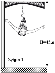 Ένας μικρόσωμος μαθητής μάζας m=50kg αποφασίζει να κάνει bungee–jumping από γέφυρα ύψους Η=45m από το έδαφος. Δένεται λοιπόν με ελαστικό σχοινί μήκους L=15m το οποίο συμπεριφέρεται ως ιδανικό ελατήριο σταθεράς k=50N/m, και χωρίς αρχική ταχύτητα πηδάει από την γέφυρα. Το σχοινί ασκεί δύναμη μόνο όταν είναι επιμηκυμένο. Θεωρούμε τις τριβές του αέρα αμελητέες έτσι ώστε η κίνηση του για τα πρώτα δεκαπέντε μέτρα, μέχρι το σχοινί να αρχίσει να τεντώνεται να μπορεί να θεωρηθεί ελεύθερη πτώση. Από την στιγμή που το σχοινί αρχίζει να τεντώνεται και έπειτα, ξεκινά αρμονική ταλάντωση, με σταθερά D=k.