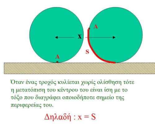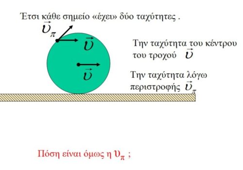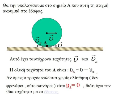 1) Στην κύλιση επί του εδάφους, το εκάστοτε σημείο επαφής του στερεού (έστω τροχός) με το έδαφος έχει μηδενική ταχύτητα.