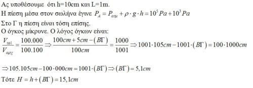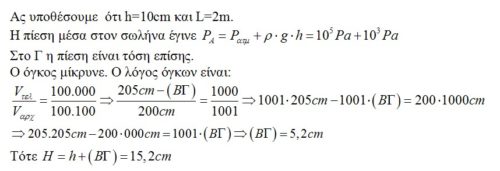 Ακριβώς αυτό είναι το ερώτημα Γιάννη. Στην άσκηση του Διονύση η βύθιση κατά 20cm που αντιστοιχεί σε αύξηση πίεσης Pat/50 θα επιφέρει μία ελάττωση του όγκου του αερίου στο σωληνάκι αντίστοιχη. Δηλαδή ένα πολύ μικρό ΒΓ. Στην πράξη μολονότι δεν φαίνεται να εισχωρεί αρκετό νερό στο σωληνάκι από τη μεριά του μπουκαλιού η υψομετρική διαφορά στο σωλήνα V είναι πολύ μικρότερη από το βάθος του μπουκαλιού όπως φαίνεται και στη φωτογραφία. Σαν να χάνεται κάπου η πίεση κατά τη “μεταφορά” της μέσα από το αέριο.