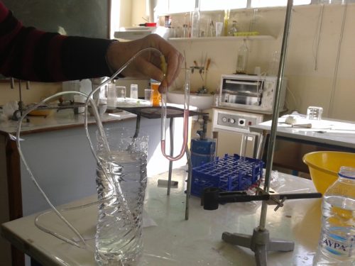 Για τη μέτρηση της πίεσης μέσα στο νερό χρησιμοποιήσαμε ένα σωληνάκι από ορό το οποίο βυθίζεται από την μία μεριά στο νερό και από την άλλη πάει σε ένα σωλήνα σχήματος V. Όταν το βυθίζουμε μέσα στο νερό τότε αλλάζει και η στάθμη στο σωλήνα V ανάλογα με το βάθος που βυθίζουμε το σωληνάκι. Η υψομετρική όμως διαφορά στο σωλήνα V δεν είναι ίση με το βάθος που βρίσκεται το σωληνάκι όπως φαίνεται και στη φωτογραφία. Και το ερώτημα είναι το γιατί αφού η πίεση μέσα στο μπουκάλι είναι pat+ρgh οπότε η πίεση στην άλλη μεριά του αέρα θα πρέπει να είναι η ίδια, άρα pat+ρgh=pat+ρgΔh’ –> h=Δh’. Ο αρχικός προβληματισμός τέθηκε από το συνάδελφο Ηλία Καλογήρου ( κοιτάξτε τα τοπικά θέματα EUSO 2017 του νομού Ηλείας)
