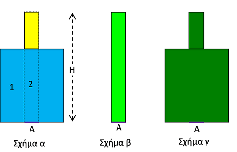 Συμφωνούμε κατ’ αρχάς ότι, στο σχήμα α, η δύναμη που ασκείται στο τμήμα Α του πυθμένα είναι ίση με το βάρος του υπερκείμενου υγρού ( κίτρινο + μπλε 2) και την δύναμη της ατμόσφαιρας.