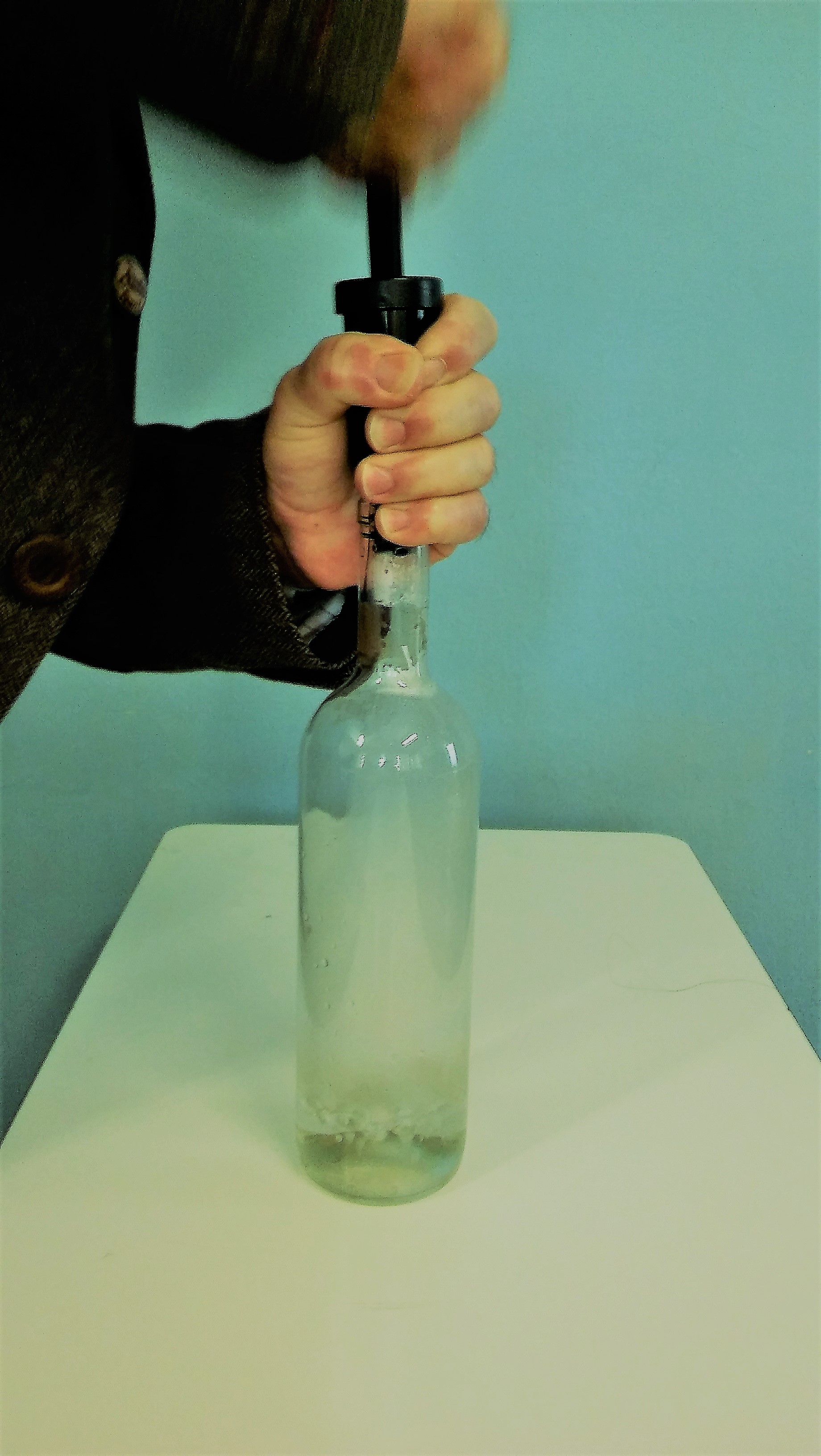 Παρεμπιπτόντως, ο άλλος Γιώργος μου έμαθε μια εναλλακτική οικονομική διάταξη, που προσφέρεται περισσότερο για επίδειξη. Ένα διαφανές μπουκάλι κρασιού, που περιέχει ζεστό νερό περίπου στο 1/5 του όγκου του, ταπώνεται με χειροκίνητη λαστιχένια αντλία αέρα απ’ αυτές που υπάρχουν και στις κάβες. Την έχει εμπνευστεί από την πλούσια εμπειρία του ως μερακλής γευσιγνώστης. Δεν αποκλείεται, λόγω της απλότητάς της να “κυκλοφορεί” και αλλού.