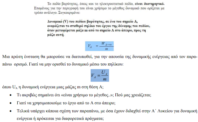 Θεωρώ ένα βαρυτικό πεδίο που σχηματίζεται από 10 ουράνια σώματα..Τι νόημα έχει για ένα μαθητή ο ορισμός V=U/q αφού δεν μπορεί να υπολογίσει, ούτε να κατανοήσει πως υπολογίζεται, αν δεν προσφύγει στο έργο, τη δυναμική ενέργεια.. Το ίδιο συμβαίνει με το ηλεκτρικό πεδίο.. Προσωπικά όριζα πάντα το δυναμικό σαν Vα =W/q (το έργο για μετακίνηση του φορίου q από το Α στο άπειρο) και οι σημειώσεις προς υποκατάσταση του βιβλίου στο ηλεκτρικό πεδίο που έδινα στος μαθητές έδιναν σαν σχέση και μόνο την V=U/q