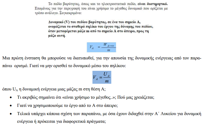 Θεωρώ ένα βαρυτικό πεδίο που σχηματίζεται από 10 ουράνια σώματα..Τι νόημα έχει για ένα μαθητή ο ορισμός V=U/q αφού δεν μπορεί να υπολογίσει, ούτε να κατανοήσει πως υπολογίζεται, αν δεν προσφύγει στο έργο, τη δυναμική ενέργεια.. Το ίδιο συμβαίνει με το ηλεκτρικό πεδίο.. Προσωπικά όριζα πάντα το δυναμικό σαν Vα =W/q (το έργο για μετακίνηση του φορίου q από το Α στο άπειρο) και οι σημειώσεις προς υποκατάσταση του βιβλίου στο ηλεκτρικό πεδίο που έδινα στος μαθητές έδιναν σαν σχέση και μόνο την V=U/q