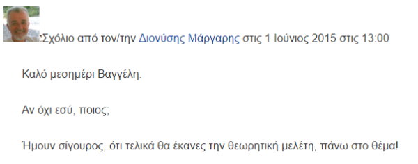 Κρίμα. Πολύ με συντάραξε το νέο. Τον θαύμαζα πολύ. Είχε το προσόν να συζητάει και τα σχολικά προβλήματα φυσικής αλλά και προβλήματα θεωρητικής φυσικής. Οι εργασίες του με ενέπνεαν. Αλλά κι αυτός εμπνέονταν απ΄ τις δικές μου. Καθότι ήταν θεωρητικός φυσικός με διδακτορικό στη κβαντική βαρύτητα. Από κοντά τον γνώρισα τον Νοέμβριο στο ΕΚΦΕ Αιγάλεω. Εκεί που παρουσίαζα τη Μάρθα. Κάναμε αρκετή ώρα παρέα αφού έχουμε κοινά επιστημονικά ενδιαφέροντα. Κρίμα που εφυγες Βαγγέλη! Τώρα νιώθω φτωχότερος.