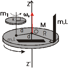 Β2. Ο οµογενής και ισοπαχής δίσκος του παρακάτω σχήµατος μάζας Μ και ακτίνας R µπορεί να στρέφεται χωρίς τριβές γύρω από κατακόρυφο σταθερό άξονα που περνά από το κέντρο του Ο.Μια κατακόρυφη δοκός  μάζας  m=Μ και μήκους L=R είναι στερεωμένη στην περιφέρεια του δίσκου. Ακόμη μια παρόμοια οριζόντια δοκός βρίσκεται στερεωμένη πάνω στην επιφάνεια του δίσκου έτσι ώστε το κέντρο μάζας της να απέχει απόσταση d=R/2 από το Ο.Επίσης σε απόσταση d από το Ο υπάρχει ένας δεύτερος δίσκος μάζας m1=m και ακτίνας r που περιστρέφεται ανεξάρτητα και χωρίς τριβές γύρω από κατακόρυφο άξονα που περνάει από το κέντρο του Κ.