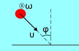 Η λεία ομογενής σφαίρα του σχήματος προσπίπτει σε λείο οριζόντιο δάπεδο υπό γωνία πρόσπτωσης φ. Λίγο πριν την πρόσκρουση η σφαίρα κινείται με ταχύτητα μέτρου υ, ενώ στρέφεται γύρω από τον άξονά της με γωνιακή ταχύτητα μέτρου ω. Αν η σφαίρα κατά την πρόσκρουσή της με το δάπεδο χάνει τα 3/4 της αρχικής μεταφορικής κινητικής της ενέργειας, ενώ ανακλάται υπό γωνία θ, τότε: