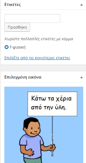 Όταν αναρτούμε θέμα το οποίο θέλουμε να εμφανιστεί στην πρώτη σελίδα, για να πάρει την εικόνα, που βάζουμε στο κείμενο, την εισάγουμε και δεξιά της σελίδας, όπως δείχνει το σχήμα: