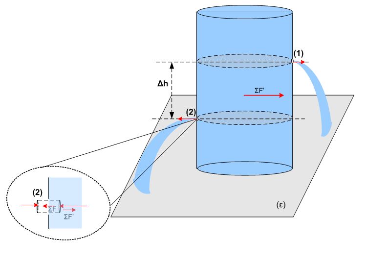 Η δύναμη που δέχεται μια μάζα dm έχει φορά προς τα έξω, οπότε από αντίδραση θα ασκεί μια δύναμη στην κυρίως μάζα του υγρού προς τα μέσα. Ξεκινώντας από τη σχέση $latex \displaystyle \Sigma \vec{F}=\frac{d\vec{p}}{dt}$ καταλήγουμε για τη συνισταμένη ότι έχει μέτρο: $latex \displaystyle \Sigma F'=2\rho Ag\Delta h$ με φορά προς τα δεξιά