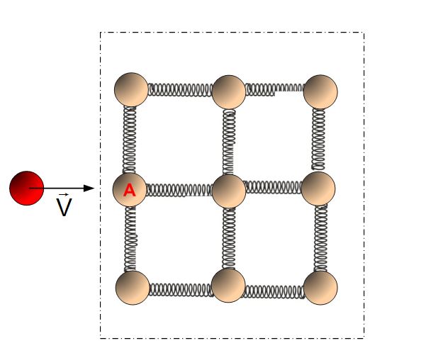 Μου αρέσει και η ιδέα αυτής της εικόνας (παρακάτω) όπου με την κρούση η κόκκινη σφαίρα κινείται και έχει ενέργεια και ορμή, την οποία κατά ένα μέρος απορροφά ο τοίχος στην ουσία αρχικά ένα μόριο του το Α, αλλά μέσω των συνδέσμων μεταφέρεται και στα άλλα μόρια και συνεπώς αυτή η μεταφορά δεν είναι ακριβώς οργανωμένη και έτσι δεν μπορούμε να διακρίνουμε κίνηση μακροσκοπικά στον τοίχο – γη…