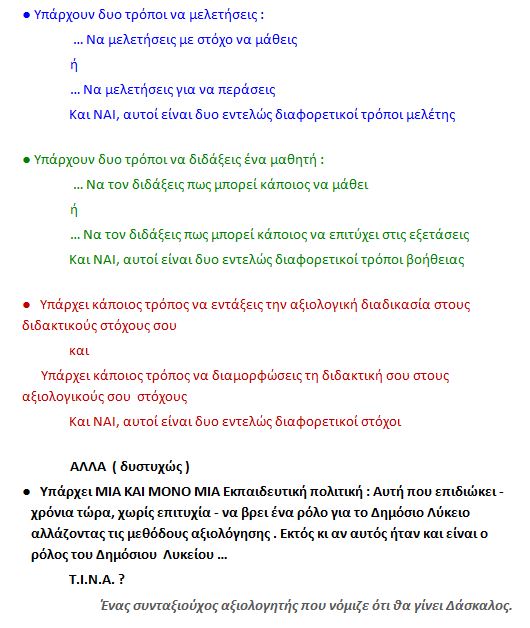 Κανέναν δεν απασχολεί το τι όργια θα συμβούν με τις βαθμολογήσεις από "εξωτερικούς αξιολογητές" των θεμάτων και των δημιουργικών εργασιών και τι απίθανη αλληλεπίδραση θα γίνεται μεταξύ γονέων, αξιολογητών και φυσικά διασχολικά, όταν π.χ. ο αξιολογητής από το άλλο σχολείο δεν θα καταλαβαίνει ή δεν θα συμφωνεί με τα θέματα του άλλου συναδέλφου καν, πόσο μάλλον αν το ένα σχολείο "στοχεύσει" τα παιδιά του άλλου.
