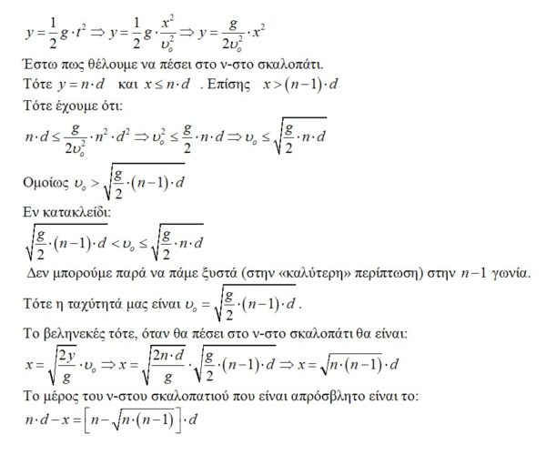 Θεωρώντας τώρα οριζόντια βολή από το ανώτερο σημείο με σημείο τομης των αξόνων (Χ,Ψ) αυτό γράφουμε τις εξισώσεις χ=υ0t kai ψ=0,5gt^2. Απ'αυτές για χ=κd και ψ=(2Ν+k)d (όπου κ το πλήθος σκαλοπατιών μετά το Νοστό )και απαλοιφή χρόνου προκύπτει β΄θμια ως προς κ που μας δίνει θετική λύση κ=2Ν.