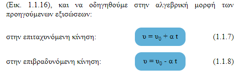 Ειδικά η εικόνα με τις εξισώσεις ταχύτητας, που παραθέτετε από το σχολικό βιβλίο, είναι πέρα για πέρα λανθασμένη. Η φυσική και μαθηματική απόρροια της διαφορικής εξίσωσεις a = dv/dt με a = σταθ., είναι η Εξ. (1.1.7). Η Εξ. (1.1.8) δεν συνάγεται από πουθενά.