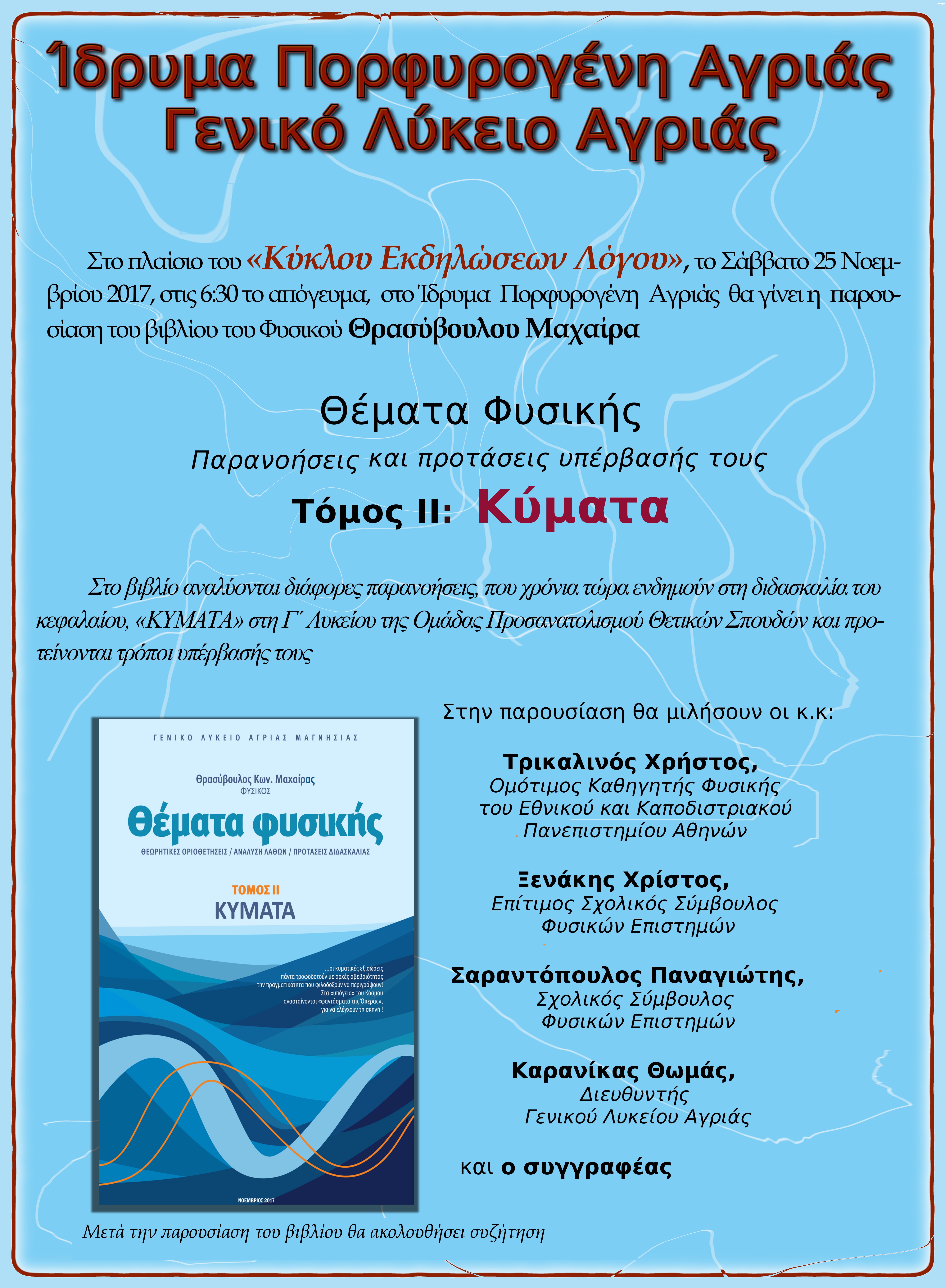 Ειμαι σιγουρος ομως πως το βιβλιο του Θρασυβουλου Μαχαιρα θα ειναι εξαιρετικη προσφορα και απαραιτητο για οποιον θα ηθελε να επεξεργαστει εναν σωστο διδακτικο μετασχηματισμο της κυματικης θεωριας . Θα το μελετησω το συντομοτερο …