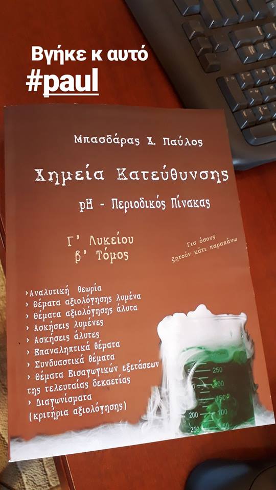 Φυσικά εύχομαι καλοτάξιδο το νέο βιβλίο σου, απόσταγμα της πολυετούς εμπειρίας σου, και είμαι βέβαιος ότι θα σταθεί άξιος αρωγός των υποψηφίων αλλά και των διδασκόντων τη Χημεία!!