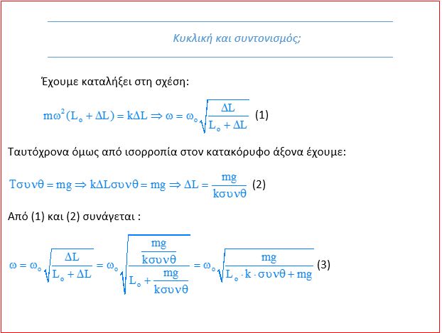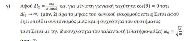 Δεν μου είναι κατανοητή. Τι σημαίνει ότι “το μήκος του εκρκεμούς απειρίζεται αφού έχει επέλθει συντονισμός και …”. Αλλάζει οπτική γωνία ωσάν να παρακολουθεί τι γίνεται στη διάρκεια κάποιου χρονικού διαστήματος που ο μηχανισμός επιταχύνει τη σφαίρα…Γιατί πρέπει να συνδέεται η μέγιστη γωνιακή ταχύτητα με όρους που παραπέμπουν σε εξαναγκασμένη ταλάντωση και σε συντονισμό;