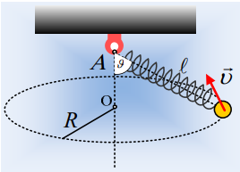 Το ελατήριο έχει φυσικό μήκος l0 και έχει προσδεθεί σε σταθερό σημείο Α, ενώ στο άλλο το άκρο έχει προσδεθεί μια σφαίρα. Όταν η σφαίρα ισορροπεί με το ελατήριο κατακόρυφο, προκαλεί επιμήκυνση του ελατηρίου κατά y1. Θέτουμε σε περιστροφή τη σφαίρα σε οριζόντιο επίπεδο, οπότε διαγράφει κύκλο κέντρου Ο, ενώ ο άξονας του ελατηρίου σχηματίζει γωνία θ με την κατακόρυφη.