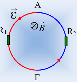 Ας πάρουμε το σχήμα, για λόγους συμμετρίας όπου έχουμε ένα κυκλικό αγωγό με αντίσταση R1 στο αριστερό ημικύκλιο και R2 στο δεξιό. Το μεταβαλλόμενο μαγνητικό πεδίο, το οποίο καλύπτει αποκλειστικά το χώρο εσωτερικά του κυκλικού αγωγού, «γεννάει» το ηλεκτρικό πεδίο με δυναμικές γραμμές ομόκεντρους κύκλους. Μια δυναμική γραμμή ταυτίζεται με τον κύκλο μας και στο σχήμα έχει σχεδιαστεί η φορά της.