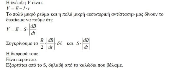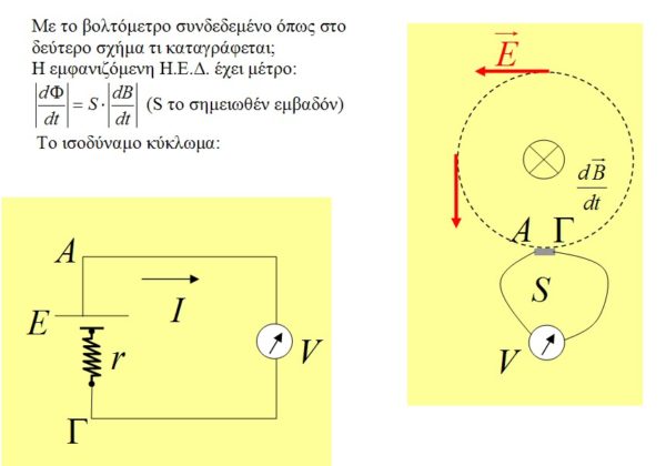 Συμπέρασμα; Οι τάσεις στα άκρα ΑΓ είναι «ίσες» πριν βάλουμε τα βολτόμετρα. Μόλις συνδεθούν αυτά, με καλώδια τυχαίου σχήματος, που περικλείουν τυχαίες επιφάνειες, εμφανίζονται επιπλέον ΗΕΔ στους δύο βρόγχους με αποτέλεσμα οι τάσεις μεταξύ Α και Γ να μην είναι πλέον «ίσες» και τα δύο βολτόμετρα να δείχνουν διαφορετικές ενδείξεις…