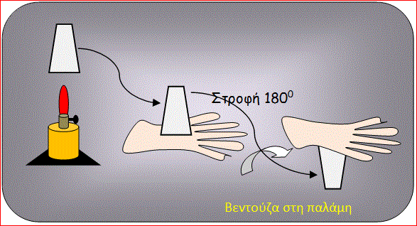 "Αν η φλόγα είναι έντονη ώστε να θερμανθεί ο αέρας μέσα στο ποτήρι τότε αυτός θα διασταλεί και ένα μέρος του θα φύγει περνώντας μέσα από το στρώμα του νερού στην ατμόσφαιρα. Στη συνέχεια ο αέρας που έχει παραμείνει στο ποτήρι ψύχεται και συστέλλεται."