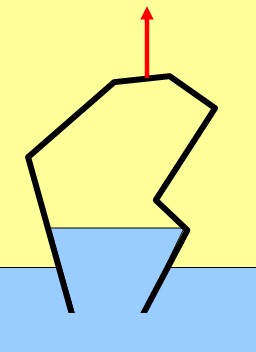 Η άνωση του νερού (αν το δοχείο έχει λεπτά τοιχώματα) είναι ίση με το βάρος του νερού που περικλείεται από την εστιγμένη μπλε γραμμή.