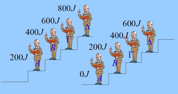 Έχασε 800 J , τόση ενέργεια όση είχε ο πιο πάνω κύριος, ο Δ που όμως κατέβηκε μόνο ένα σκαλοπάτι (χάνοντας μόνο 200 J).