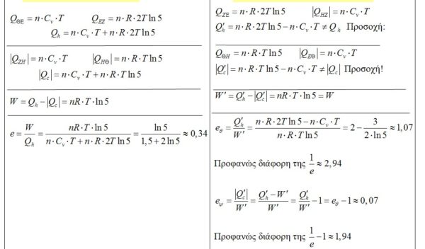 Άρα κατά τη διάρκεια ενός κύκλου απορροφήθηκαν από την ψυχρή δεξαμενή QΔΓ=140J και επέστρεψαν σε αυτή QΑΔ=300J. Οπότε όχι μόνο δεν έχουμε απορρόφηση θερμότητας από την ψυχρή δεξαμενή αλλά αντίθετα σε κάθε κύκλο εισέρχονται σε αυτή 160J θερμότητας.