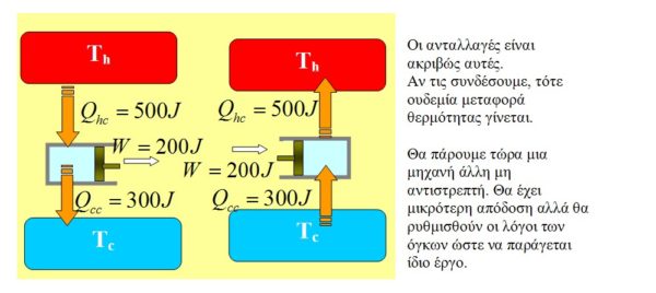 Το μοντέλο με τις δύο δεξαμενές και τις δύο μηχανές, λειτουργεί μόνο αν οι δύο μηχανές (λειτουργώντας ως θερμικές) έχουν την ίδια απόδοση, αλλιώς πάντα δείχνει να παραβιάζεται ο 2ος νόμος. Άλλωστε εκεί στηρίζεται και η λογική των “αντιστρεπτών μηχανών”…